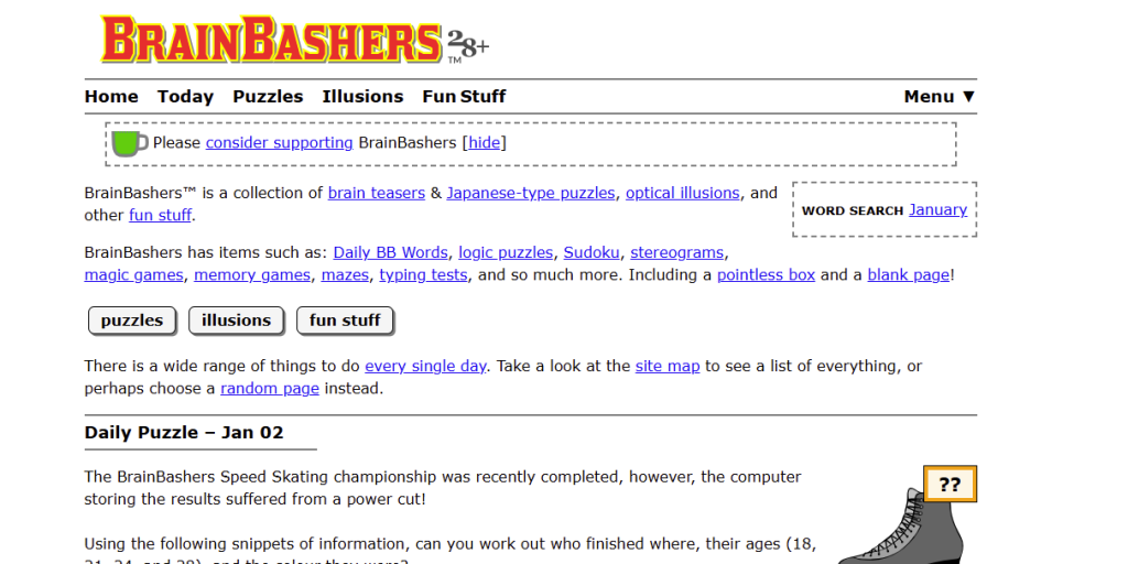 BrainBashers is an online platform founded in 1998, meaning it existed before most brain apps began tracking streaks. The site offers thousands of logic puzzles, riddles, math challenges, visual illusions, and Japanese-style puzzles that demand real thinking.